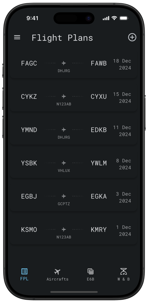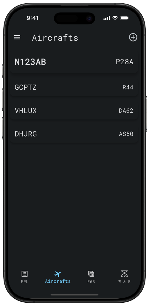 Add your aircraft by clicking the “+” icon in the top right corner of the screen. Fill the necessary fields then save, and the app will remember your aircraft for faster future flight plan filing.